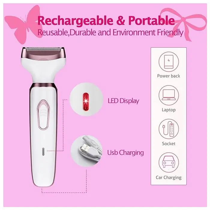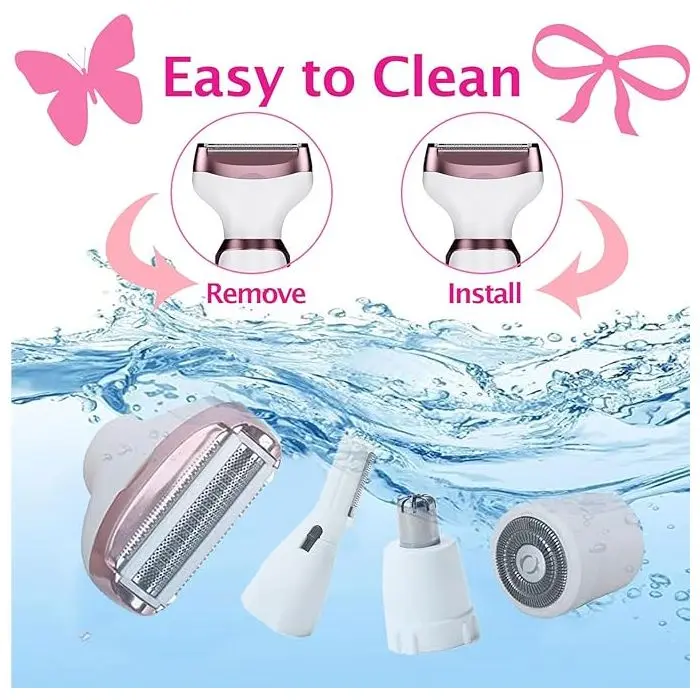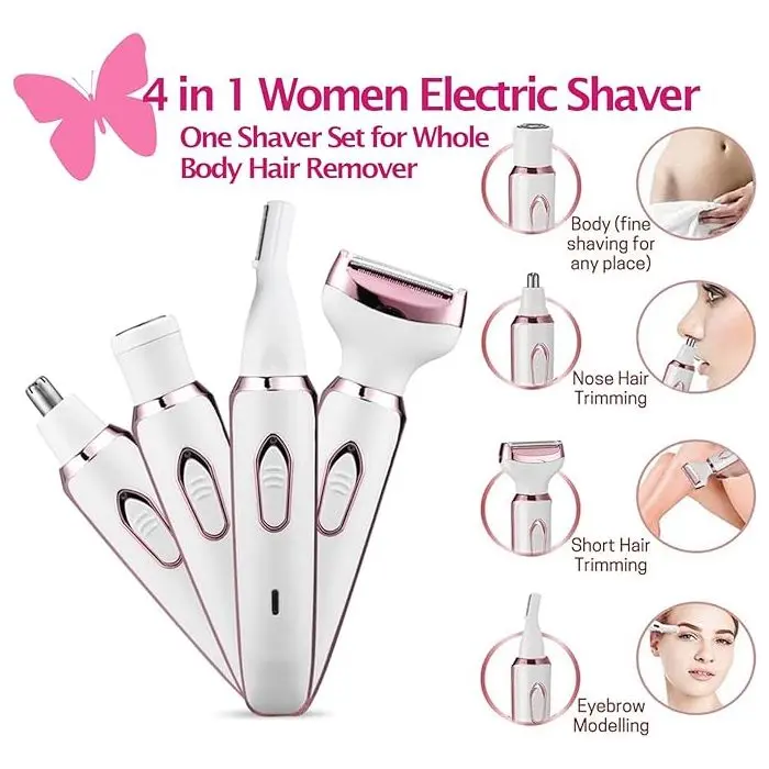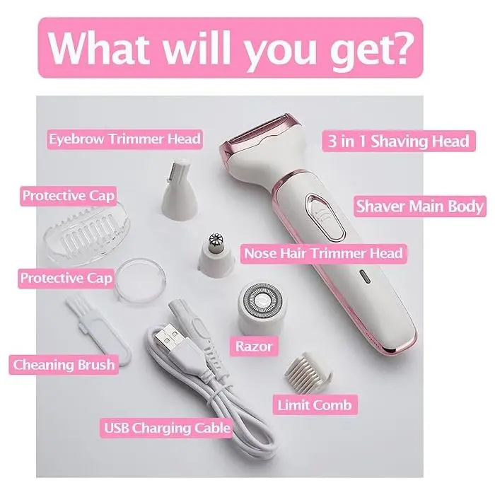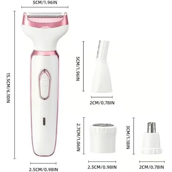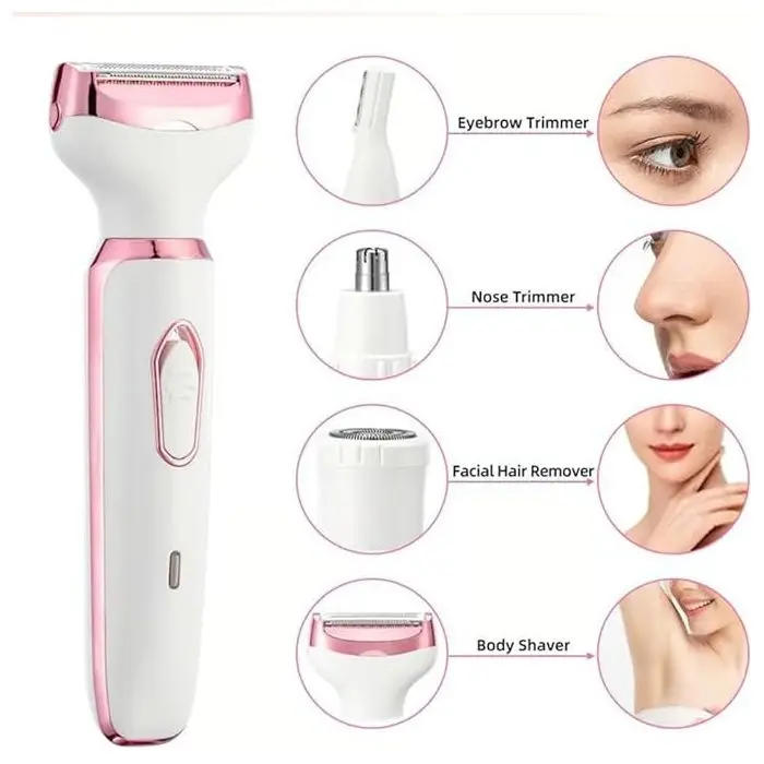 Con sus cuatro cabezales intercambiables, te permite afeitar y perfilar de forma segura diferentes áreas del cuerpo, ofreciéndote un aseo versátil y preciso. Su diseño ergonómico y recargable la hace fácil de usar en cualquier momento y lugar.Funciones y Accesorios:Afeitadora Corporal y Facial: Con cabezales diseñados para afeitar y perfilar el vello del rostro, brazos, piernas y el área del bikini de manera suave y segura.Corta-pelo de Nariz y Perfilador de Cejas: Incluye un cortapelo de nariz y un perfilador, ideales para un acabado preciso en las zonas más delicadas.Cabezales Intercambiables: Cuenta con cuatro cabezales que se adaptan a diferentes necesidades de depilación, permitiendo una limpieza especial, suave y un corte preciso.Fácil de Usar y de Limpiar: Es un dispositivo simple y fácil de manejar para una variedad de estilos. Además, es lavable e incluye un cepillo de limpieza para mantener la higiene.Recargable y Portátil: Se carga fácilmente a través de USB, brindando hasta 45 minutos de uso con una carga completa. Su diseño de bajo ruido y su tecnología inteligente la hacen perfecta para usar en cualquier momento.Características del producto:Modelo: Epilador Facial 4 en 1.Tipo de alimentación: Recargable.Funciones: Afeitadora corporal, epilador facial.Zonas del cuerpo: Brazos, Piernas, Rostro, Área del bikini.Cantidad de cabezales: 4.Accesorios incluidos: Cabezal de limpieza y cepillo de limpieza.Cantidad de velocidades: 1.Es recargable: Sí.Es lavable: Sí.